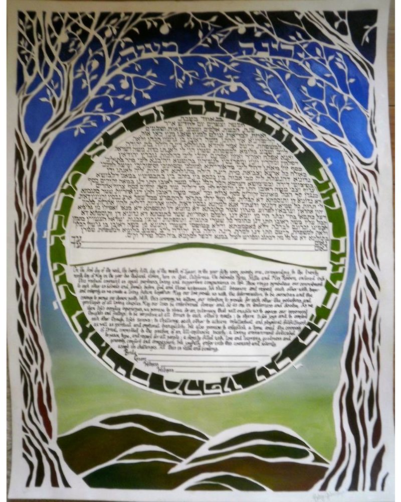 In addition to her ketubot, Batya designs and creates wall murals, paintings, portraits, personalized wedding and Bar/Bat Mitzvah invitations, and Judaica. She paints representative pieces, often focusing on ‘the human experience’ and the emotions that accompany being open to life’s beauty. Batya not only ensures that she has an intimate relationship with her pieces, but makes sure that her clients feel moved and inspired by the artwork that she creates for them, as well.