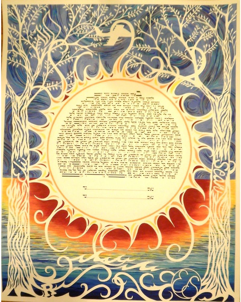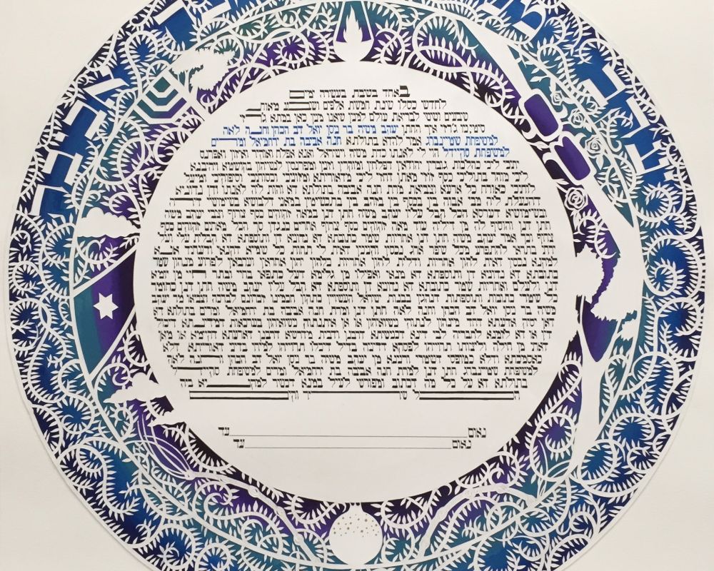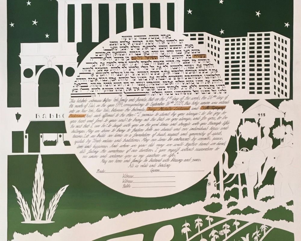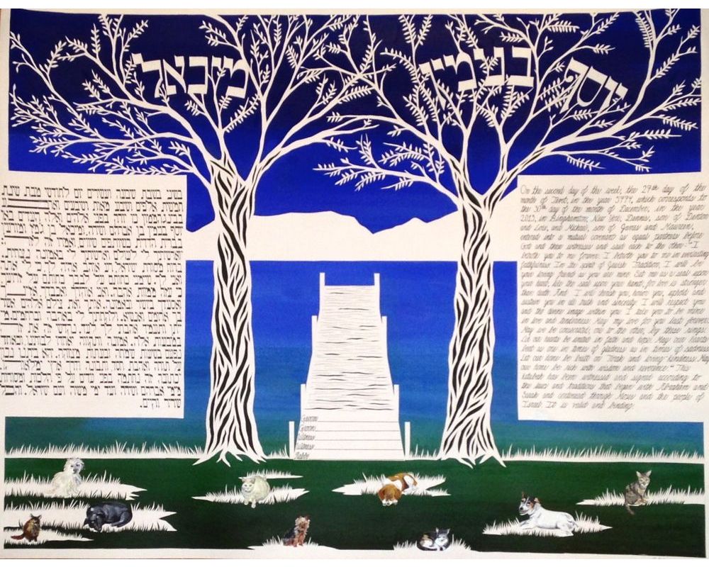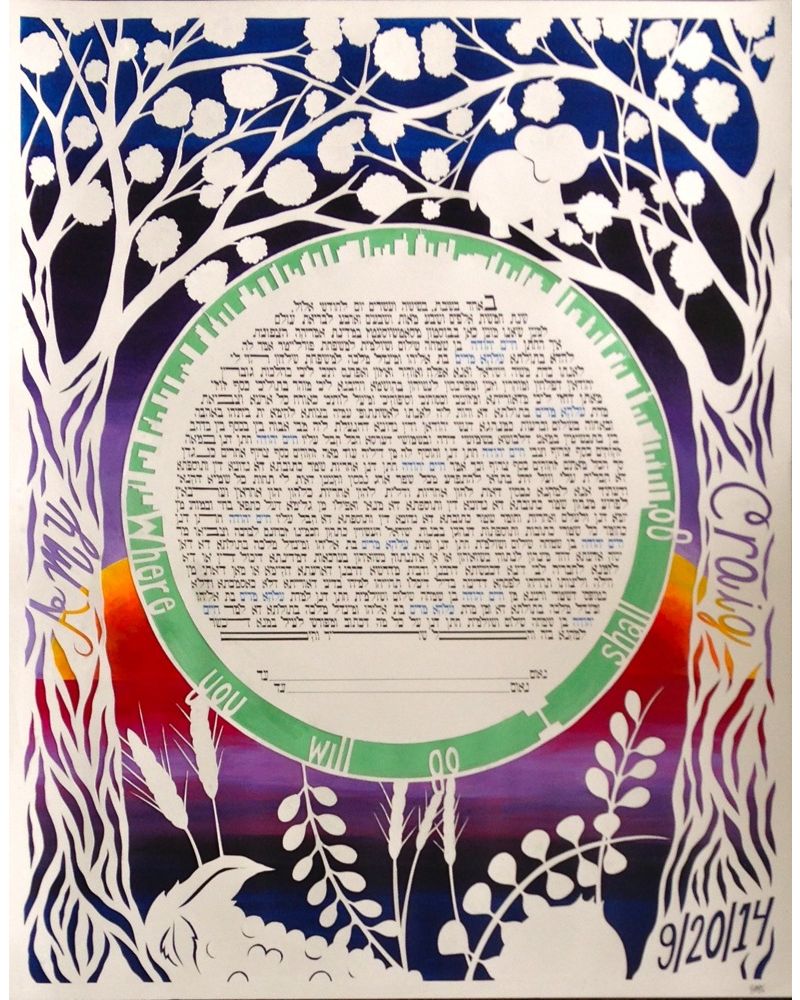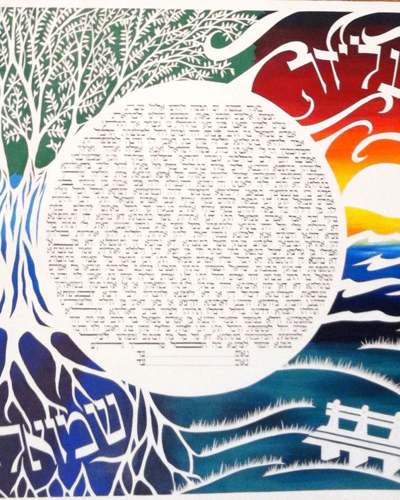 is an independent artist living in New York City. She works in a variety of mediums, including oil, watercolor, charcoal, acrylic, and paper-cut. She creates custom ketubot with both traditional and modern abstract imagery, producing designs that resonate with each couple and represent their interests, hopes, and unique relationship. Batya works closely with each engaged couple to ensure they feel their ketubah accurately and beautifully portrays their love.