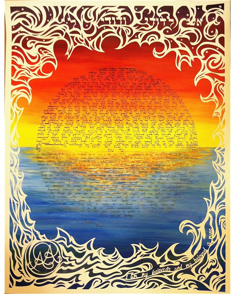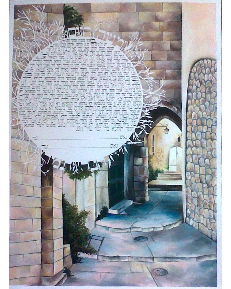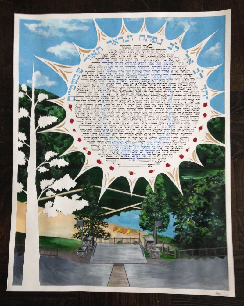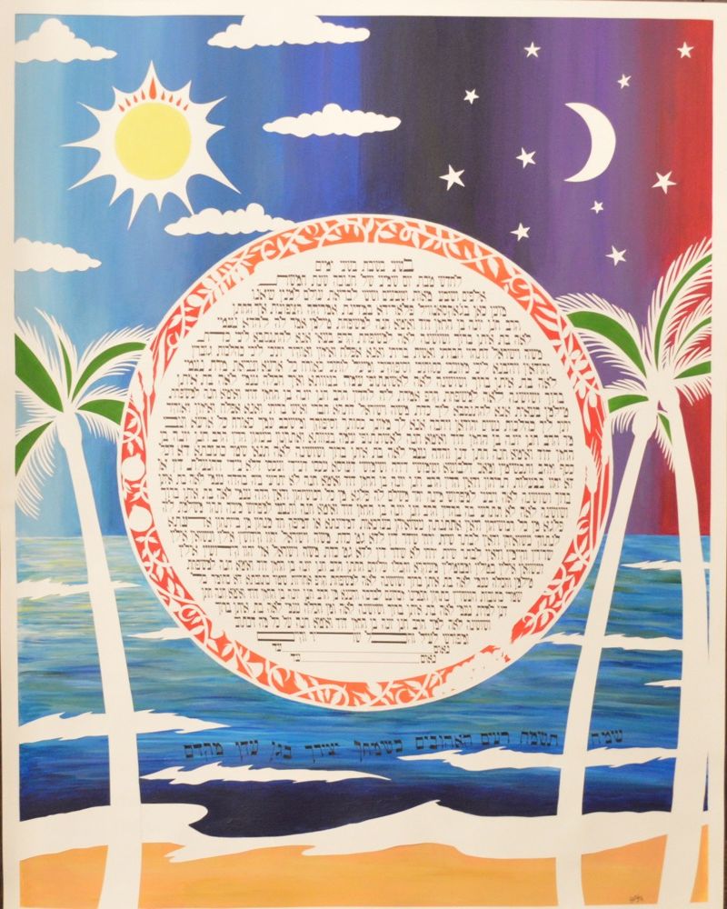 In addition to her ketubot, Batya designs and creates wall murals, paintings, portraits, personalized wedding and Bar/Bat Mitzvah invitations, and Judaica. She paints representative pieces, often focusing on ‘the human experience’ and the emotions that accompany being open to life’s beauty. Batya not only ensures that she has an intimate relationship with her pieces, but makes sure that her clients feel moved and inspired by the artwork that she creates for them, as well.